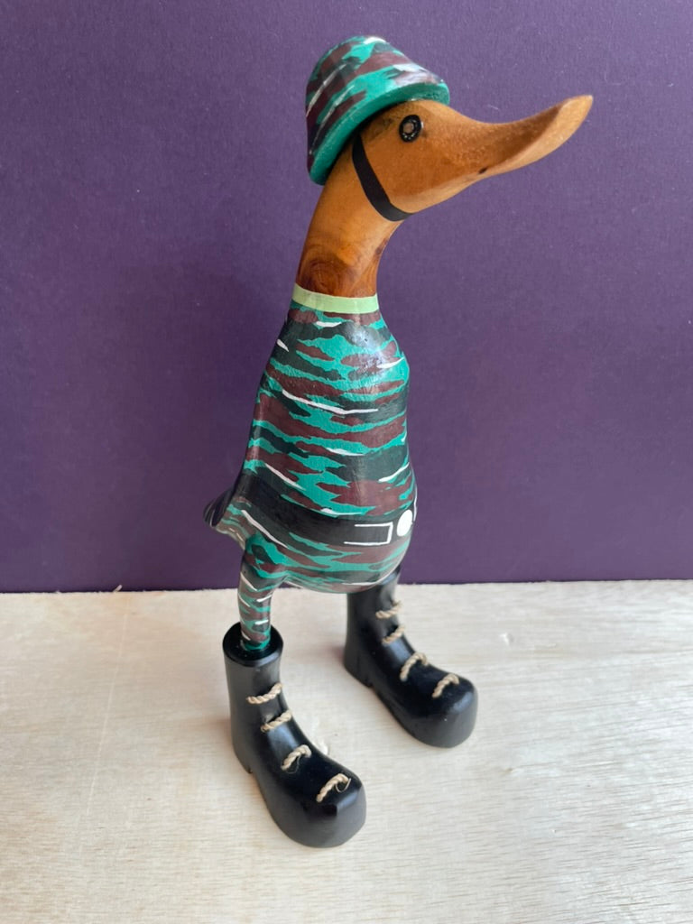 Dressed in camouflage with helmet attached this army duck is ready for combat! Style your home with this duck so that it stands pride of place, looking good and bold in green and brown tones.