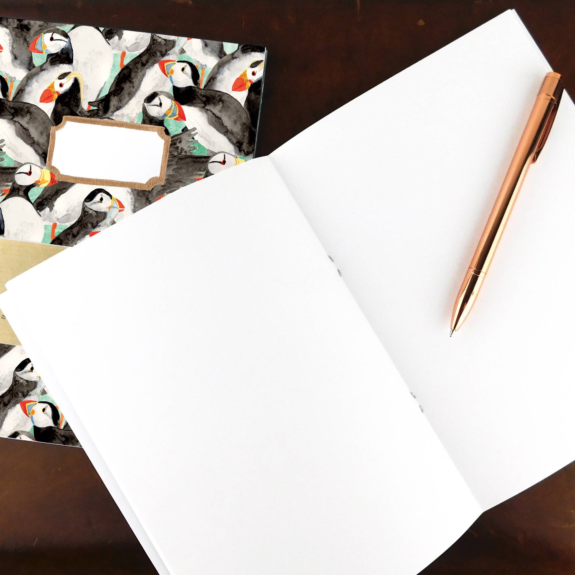 A improbability of adorable, bundle of puffins! Totally stunning! A perfect book for jotting down notes, ideas, dreams and doodles. Each puffin is hand painted in watercolour before being digitally printed in the UK onto 300gsm recycled card using eco-friendly inks.