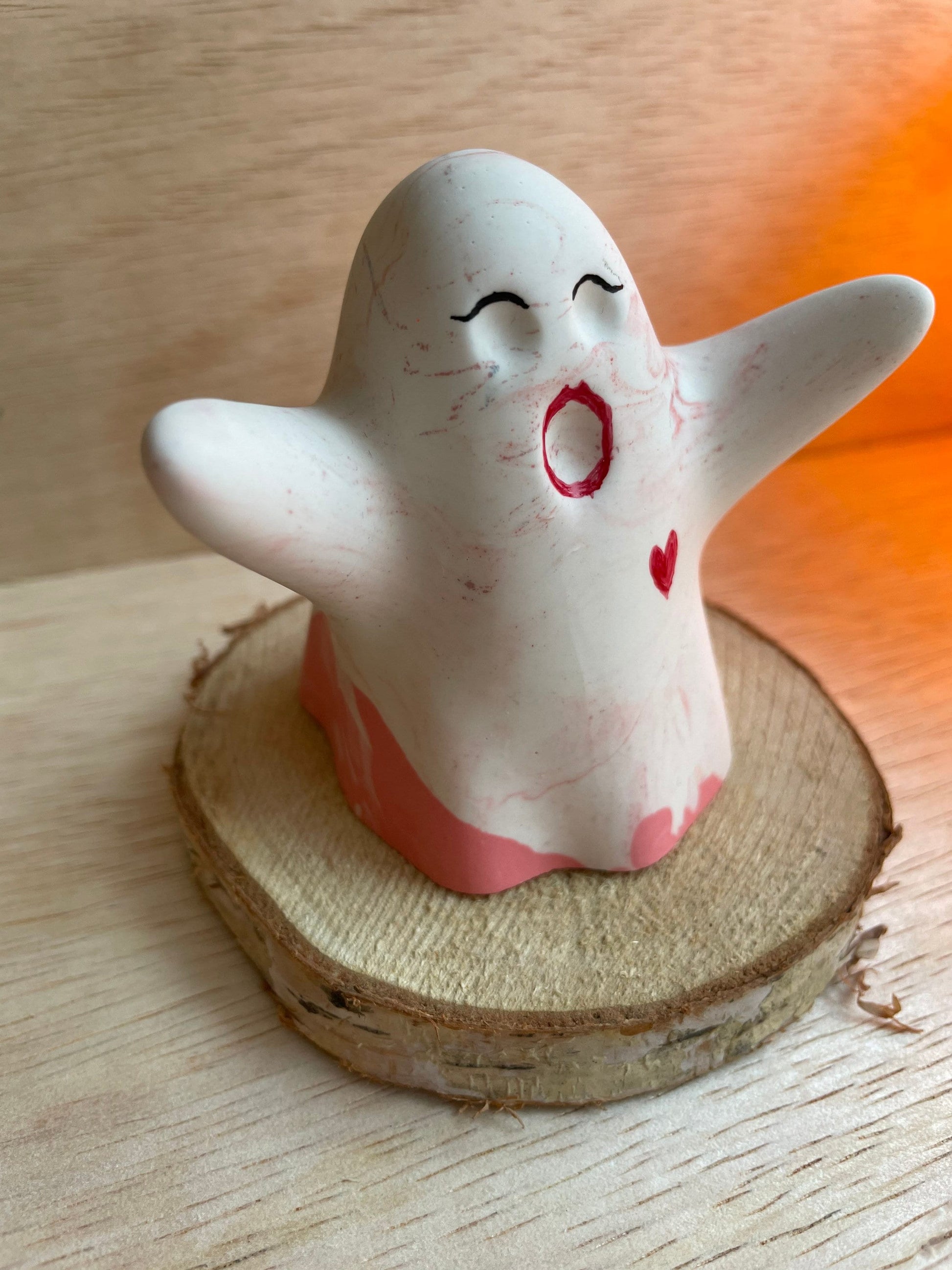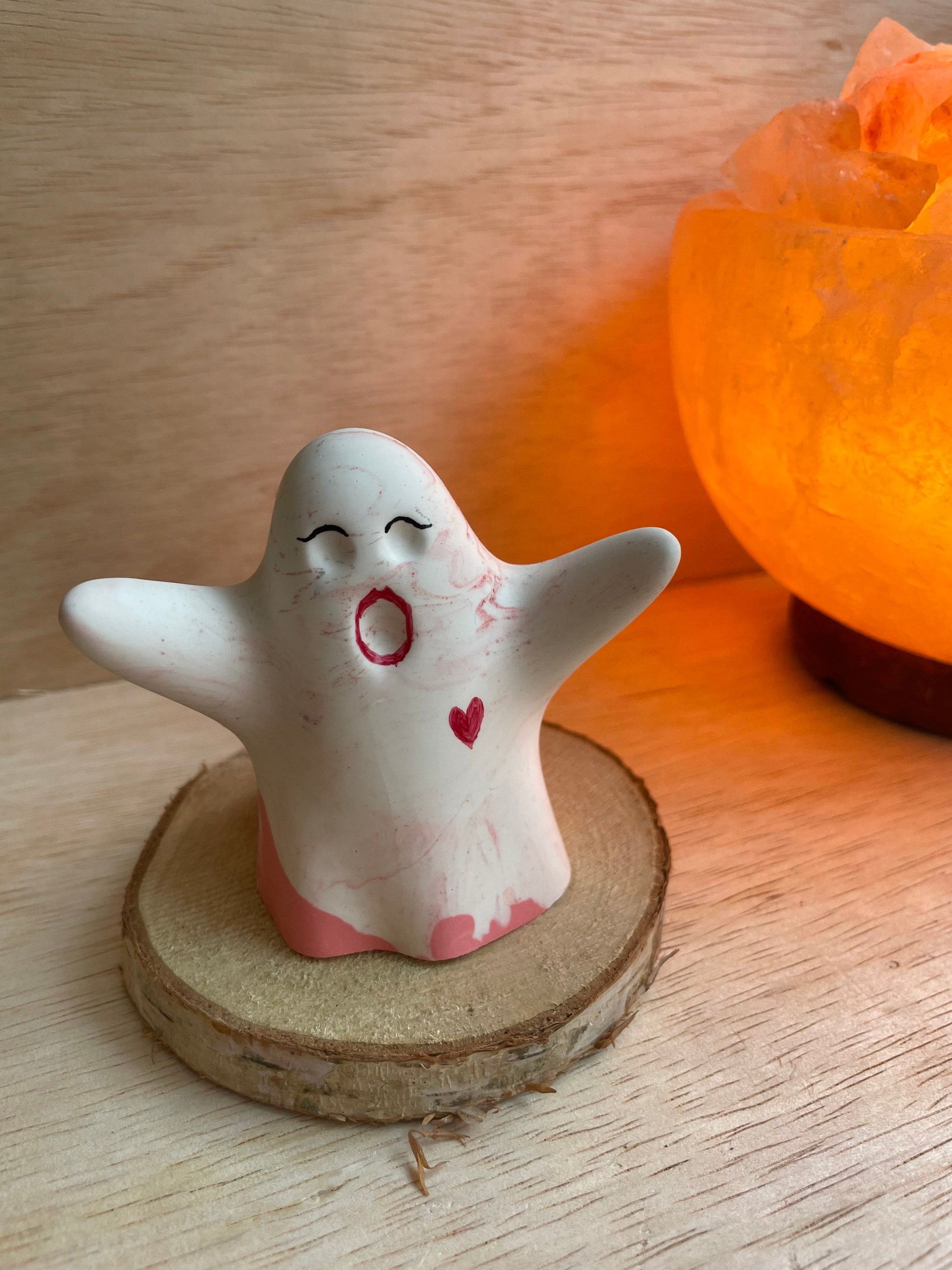 This Kiss Me ghost is a mix of white and pink marble style! With an addition of eyeliner (on point may we add!), lipstick and a tiny red heart.