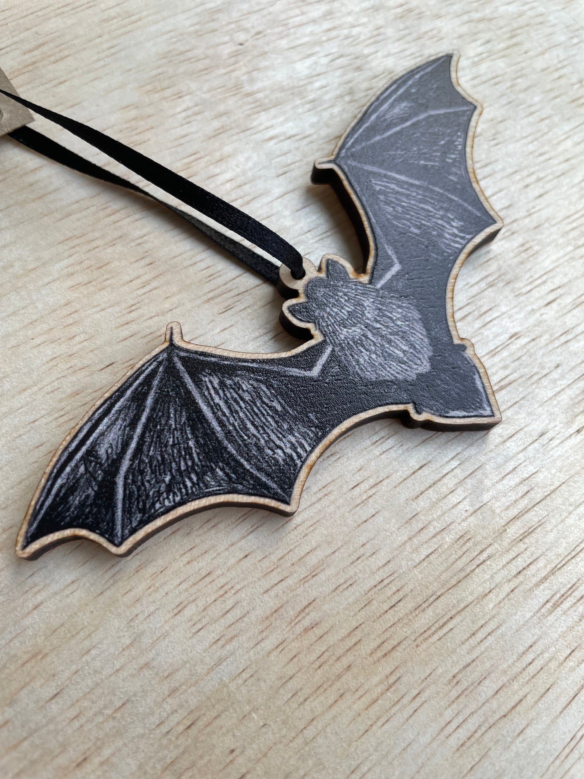 This bat has been hand painted in watercolour before being digitally printed in the UK onto 3mm laser cut birch wood and strung on a satin ribbon.