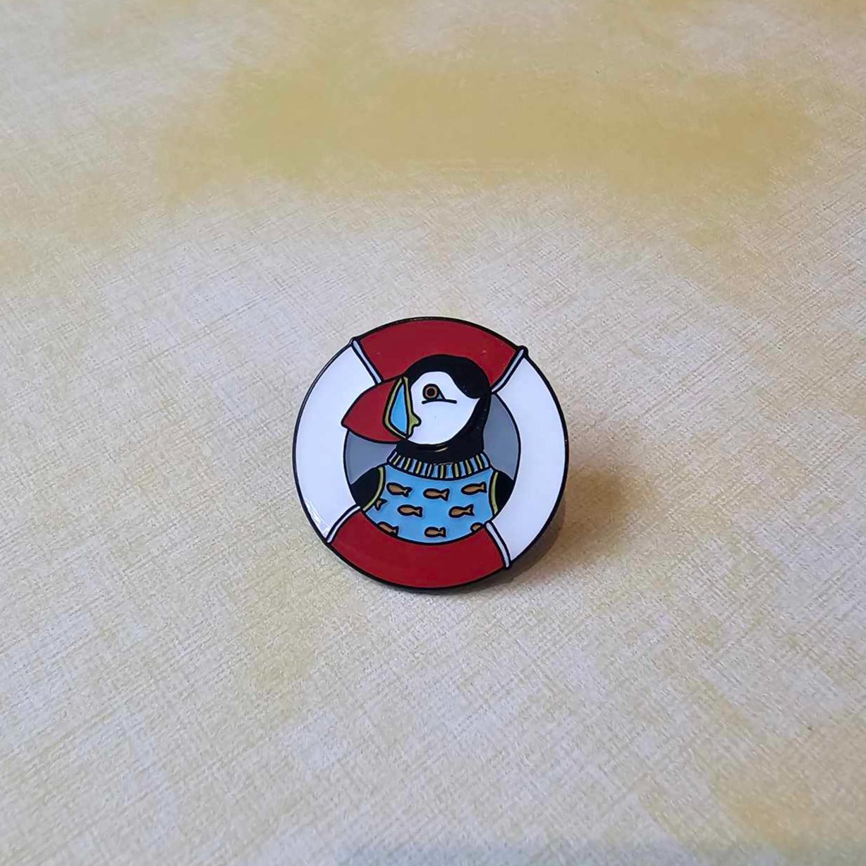 Puffin in a Life Buoy Pin Badge – a charming accessory that's as cute as it is nautical! In a circular design measuring 2.5cm in width and 3cm in height, this delightful pin features a puffin popping its head through a life buoy.